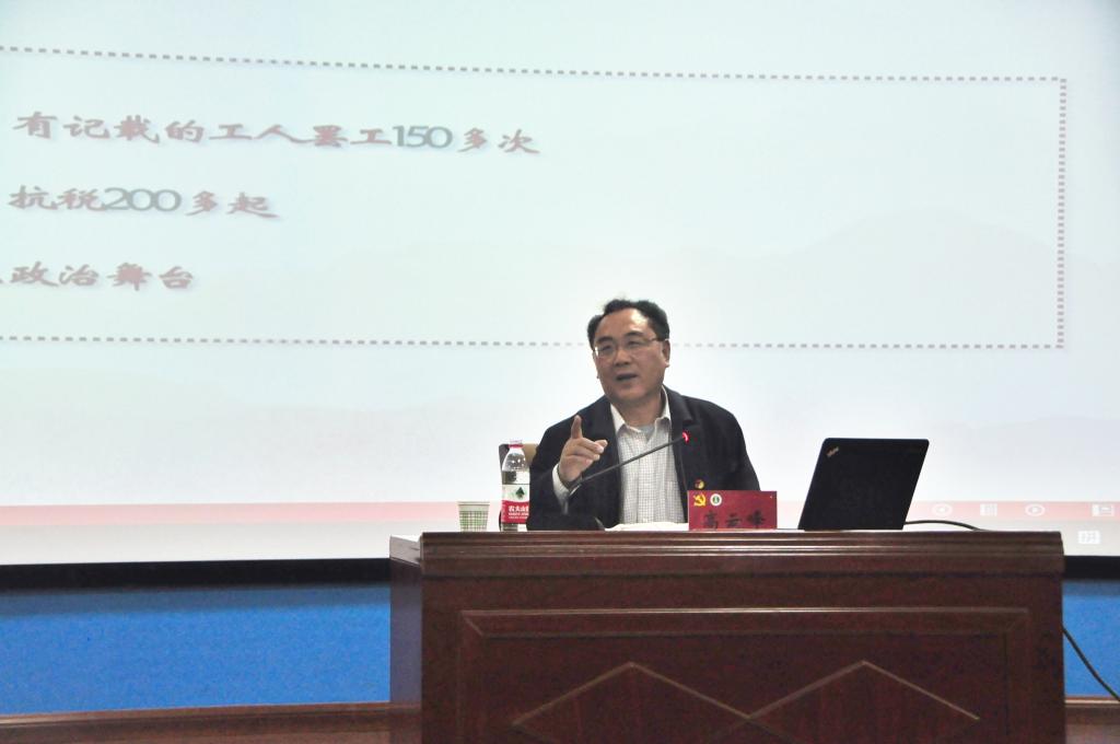 高云峰书记以《日出东方—中国共产党的诞生》为题,围绕“中国共产党成立的国内外历史背景、五四运动的巨大影响、早期共产党组织和中国共产党第一次全国代表大会”四个方面,系统阐述了中国共产党的成立,适应了近代以来中国社会进步和革命发展的客观要求,是开天辟地的大事,为中国革命指明了前进的方向。这样一个新型的马克思主义政党的诞生,不是偶然的事件,是近代中国历史发展的必然产物,是历史和人民的必然选择。