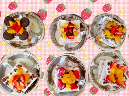 不过是简易型的,蛋糕胚用面包吐司代替。但还是好好ci呀~做的过程因为没有什么技术含量而且没有危险性所以小朋友都参与进了来。四层吐司夹心果酱,上面浇一层草莓酸奶撒一层奥利奥碎,将鲜草莓切片,黄桃罐头切块,麦咪点缀,大功告成!孩子们吃的炒鸡开心的说~味道超赞!