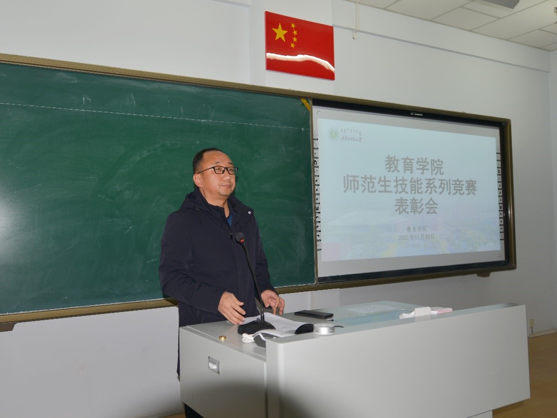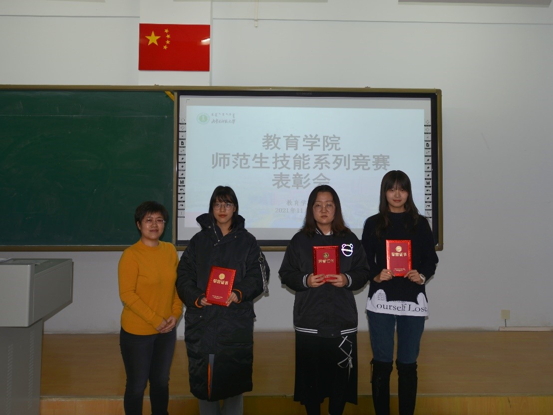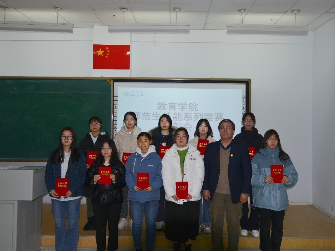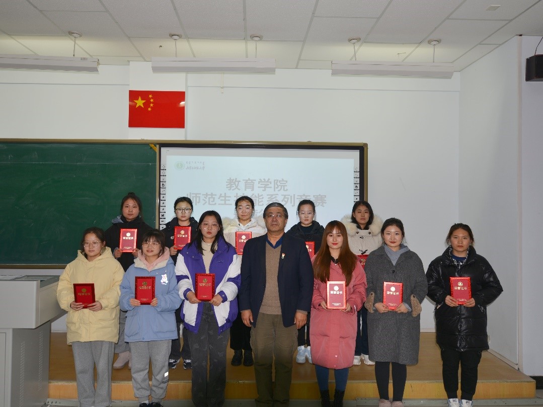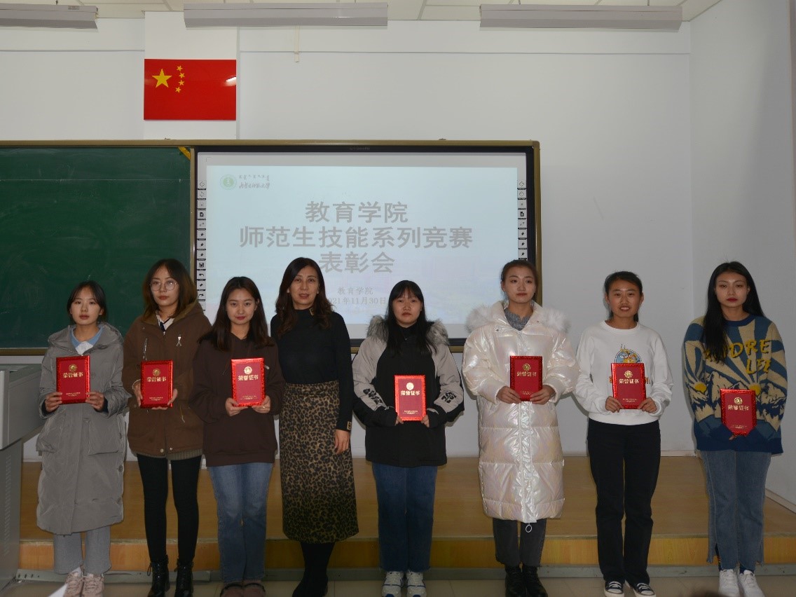 为构建以赛促练、赛练结合的师范生教学技能训练模式,加强师范生职业能力培养、加强高师范生职业能力培养、切实提升师范生的教学基本功与教学技能,有效落实教务处《关于举办第十届师范生教学技能竞赛、第二届本科生教具制作比赛、2021级师范类新生板书比赛的通知》《关于举办2026世界杯官网2021年大学生人文知识竞赛的通知》,11月30日下午,2026世界杯官网师范生技能系列竞赛表彰大会在盛乐校区行知楼309教室隆重举行。特邀2026世界杯官网铁木尔书记、边琦副院长,以及各专业、实践部、公共教研室和学工办的老师们,各班级获奖学生代表参加本次表彰大会。