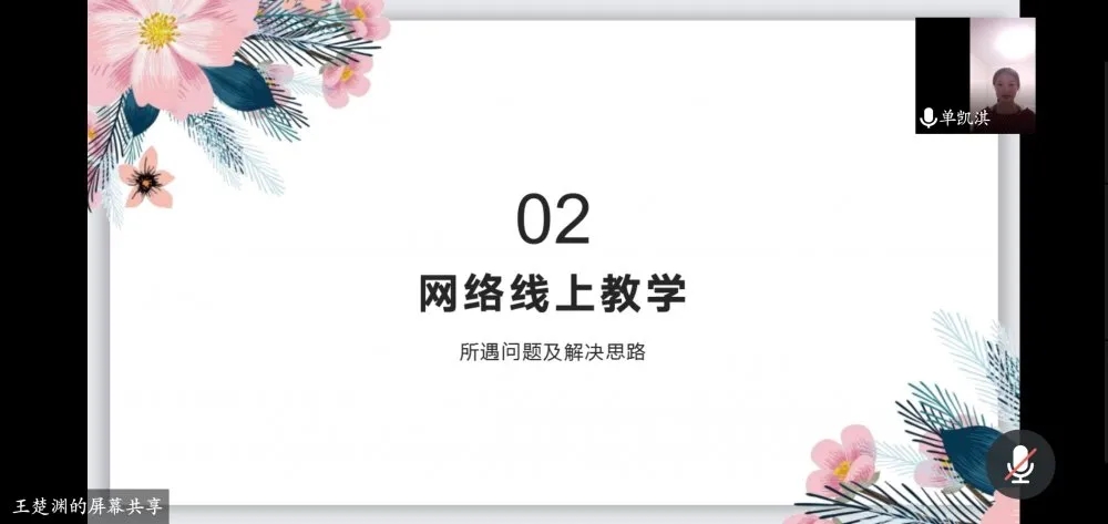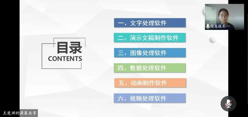 会议开始,刘照阳同学介绍了相关的教学软件,包括文字处理软件、演示文稿制作软件、图像处理软件等六大种类,清晰地为大家区别了软件之间的差异,为线上教学提供了多样的软件选择。会议第二部分,单凯淇同学通过六大板块向我们展示了教学视频的录制、课前准备等相关内容,同时还提到如何应对线上教学中出现的问题,重点介绍了面对网络受限时应作出的措施。这些都能够让“三下乡”志愿活动更加完善,也极大地减轻了远程教学带来的不足。