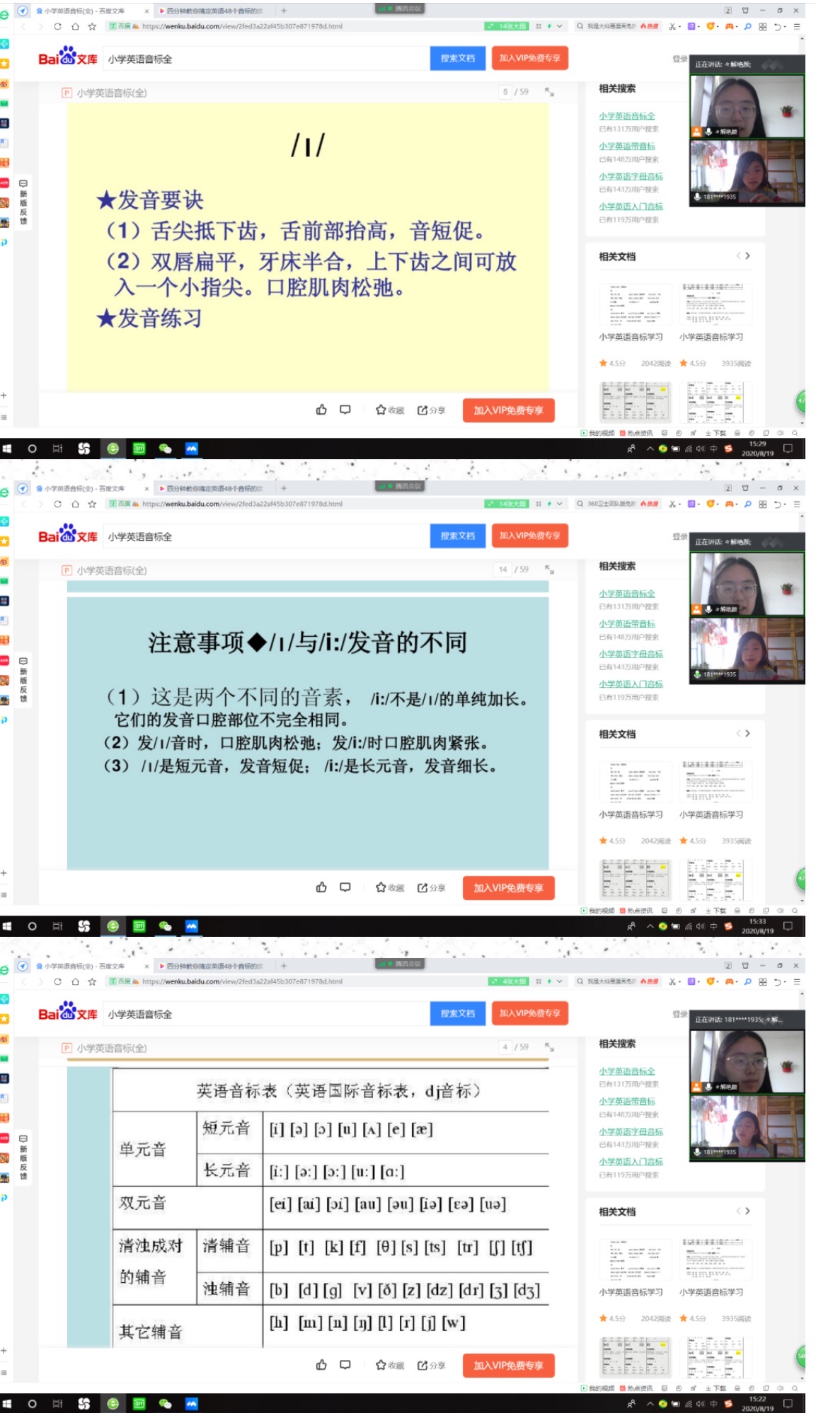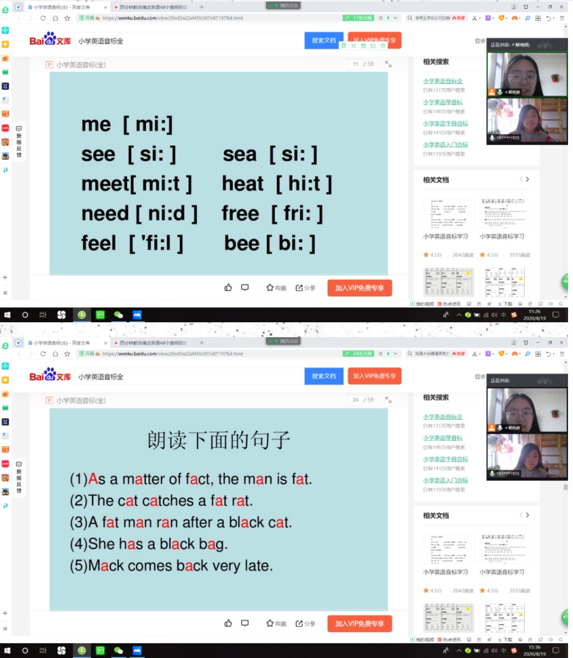 在上课前先复习了上节课学的句式变化的规律,廖同学都记得很不错,不过在肯定句变否定句的助动词配套那里还有一些问题,我用时间状语以及主语人数的多少来讲解了三个词的区分办法。这节课主要学的是音标中的单元音。我采用视频➕讲解发音➕跟读的方法来教廖同学单元音的发音情况。视频中放的是标准的音标读法,然后我通过发音告诉她单元音中短元音和长元音的区别。在她跟读发音,读对应单词和句子的过程中,她的发音也在一步步地规范起来。因为今天是读音的课程,所以我为她留的作业是找出试卷以及暑假作业中的单词,练习准确发音。