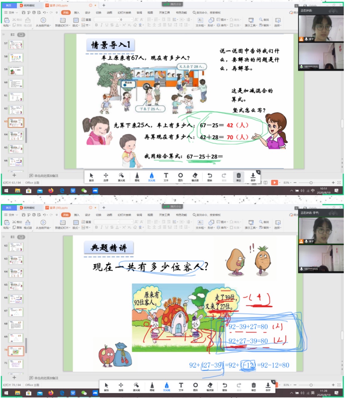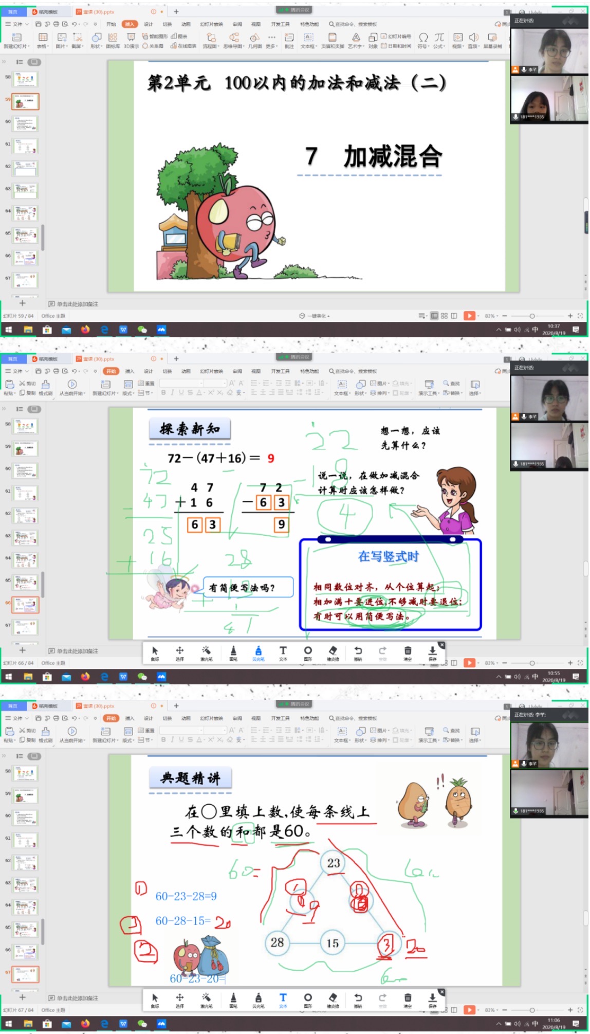 今天的内容是加减混合。学习目标是:①掌握加减混合运算的计算方式以及竖式的简便写法。②掌握加减混合算式的计算顺序并能够正确的计算。③在解决问题的过程中,体会数学在生活中的广泛应用。在迅速地复习了一遍之前的内容之后,我们便开始了今天的学习。前面都很顺利,但是在加减混合的应用题上,小廖同学出现了差错。首先是没弄懂题意,错误地使用题干中已知的信息。其次,在混合运算中使用括号这一点上,也出现了问题。于是在本次课结束以后,给她留下了与课上出错相似的题,希望她能加以练习。并且与家长友好交流,及时提供教学反馈。