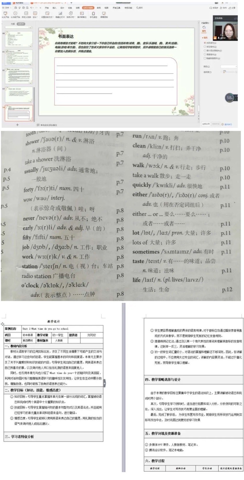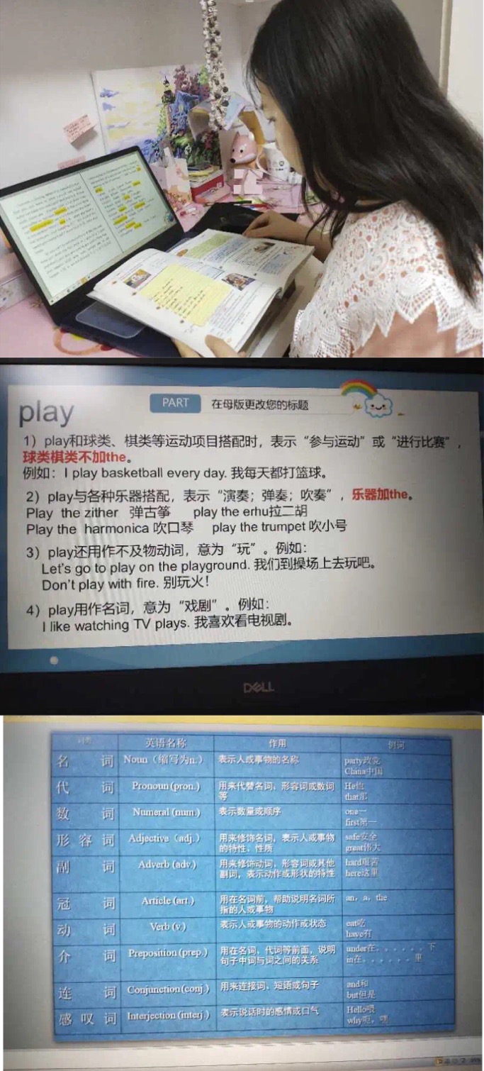 我的教学科目是初中英语。在这十五天里,从每天备课、制作PPT,再到讲课、帮助学生复习巩固,晚上进行自我评价和教学反思等等一系列活动,使我的生活变得更加规律。我的教学主要分为三个部分,分别是:单词学习、十大词性讲解和习题训练。这三个部分环环相扣,熟记单词和不同词性的区别及用法,才能够更好地理解题目。每天的课堂内容安排合理,老师教授、师生互动、学生做题三个部分相结合,让学生在轻松愉悦的氛围里学习英语。