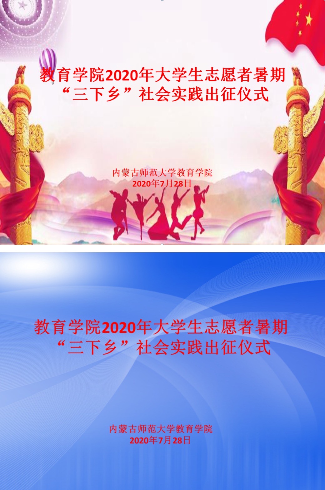 2020年7月28日晚上,世界杯官网举办了暑期云端三下乡社会实践活动出征仪式。提前一天,我们信息技术指导组着手制作出征仪式所需定屏。我制作了两版初稿。