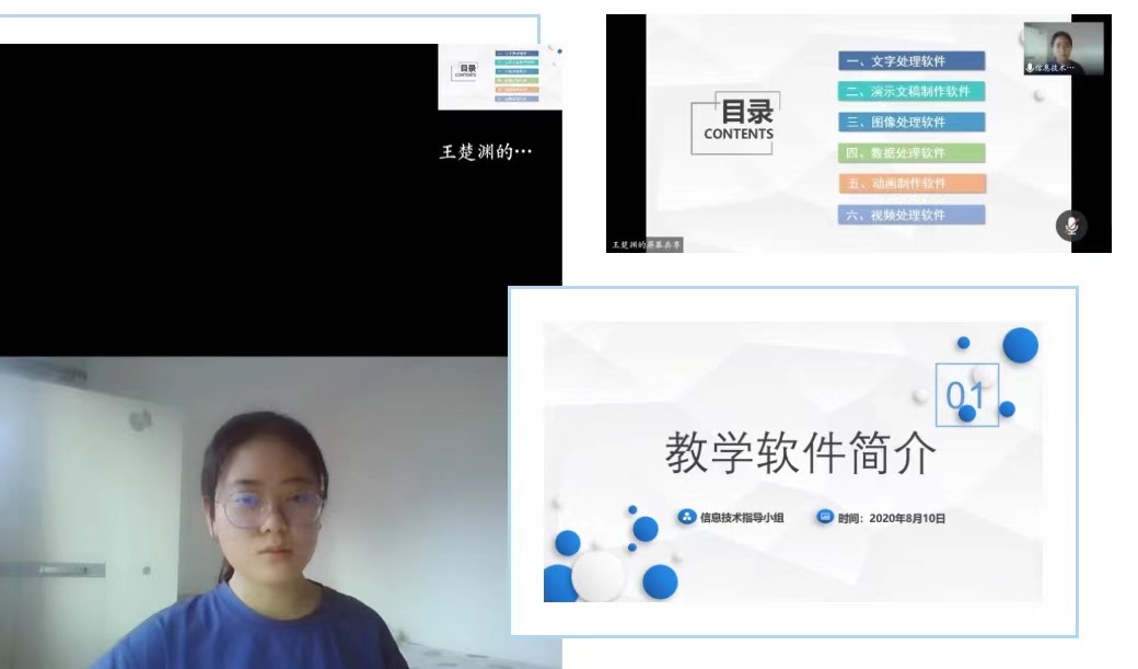 响应学院的号召,很荣幸能够参与暑期云端三下乡的社会实践活动,鉴于今年情况特殊,在疫情防控常态化的形式上开展线上教育,作为一名信息技术指导小组的成员,我们的主要工作就是保障整个线上课程的流畅,确保各学科志愿者的线上的辅导任务顺利完成,提升志愿者的教学实践技能。在信息技术交流活动中,我主要向志愿者介绍了教学过程中会使用到的各类软件,把软件分为六大部分,分类具体阐述各类软件的差异,帮助志愿者最优化选择教学软件,进而更高效的传递知识。