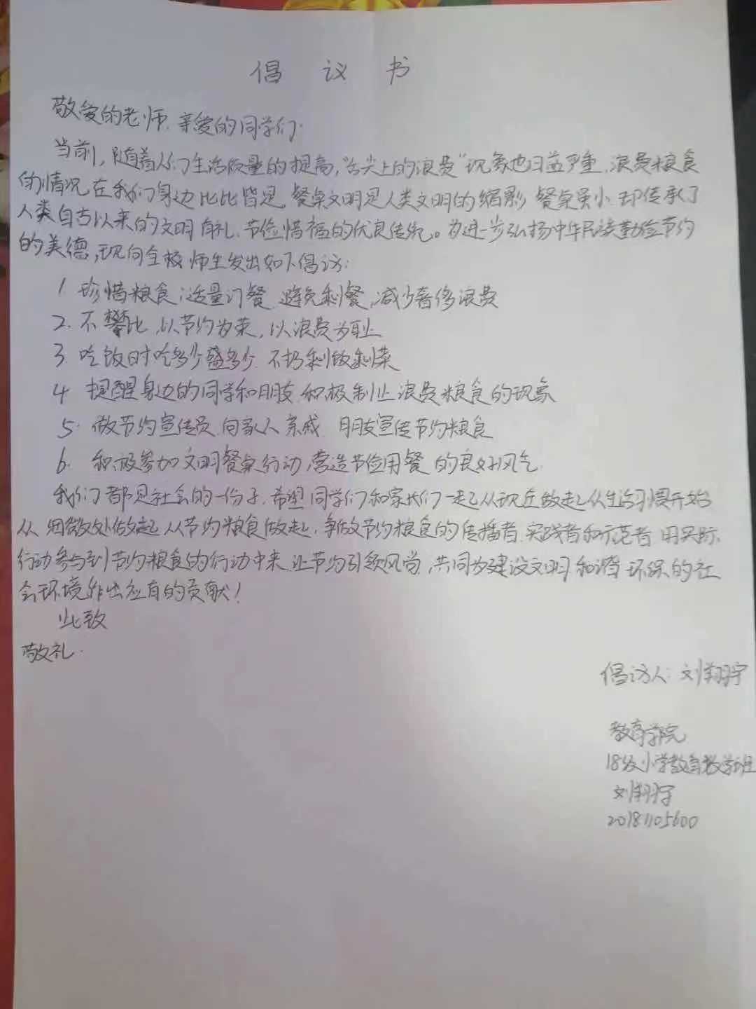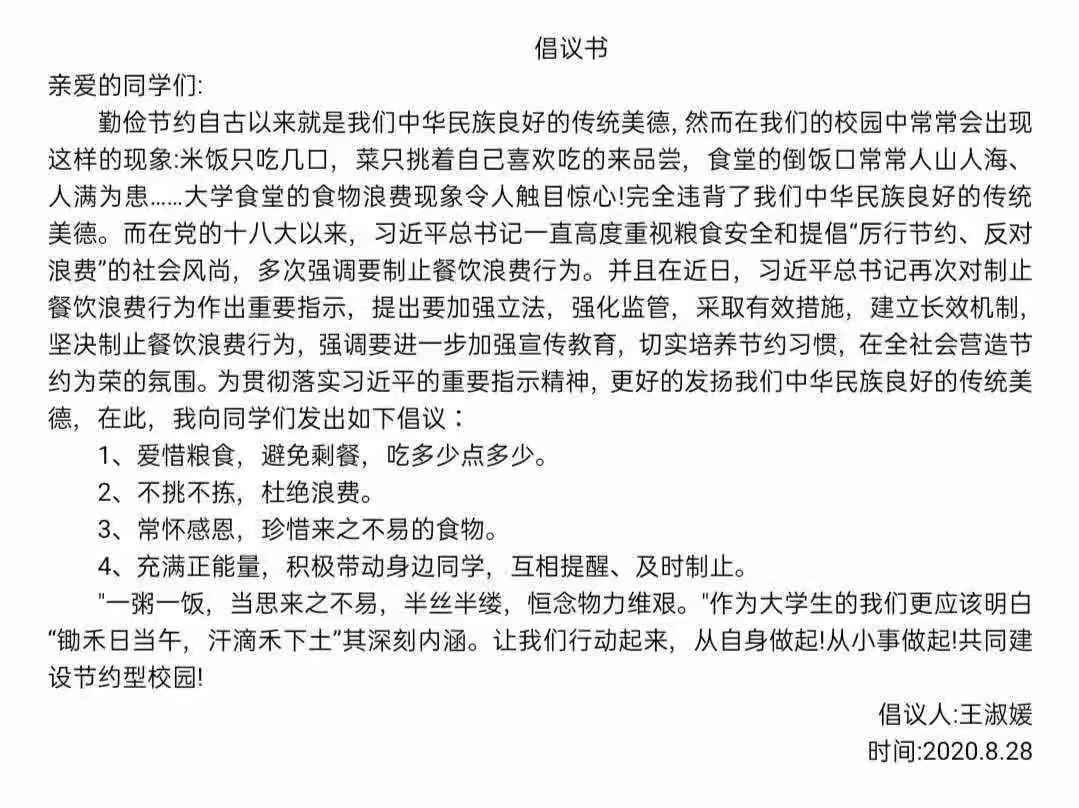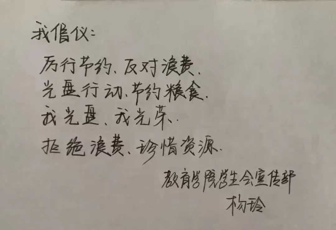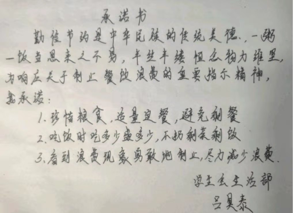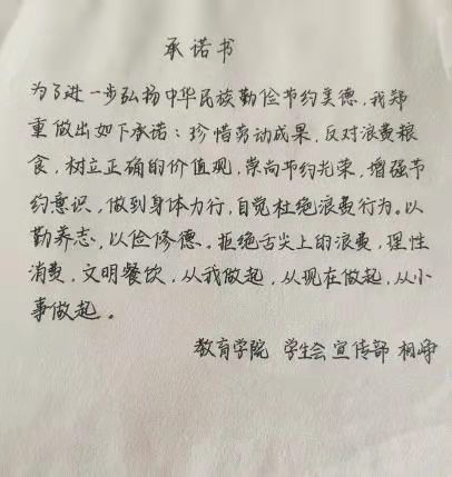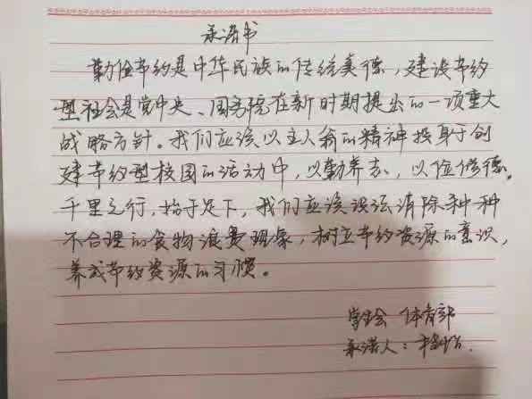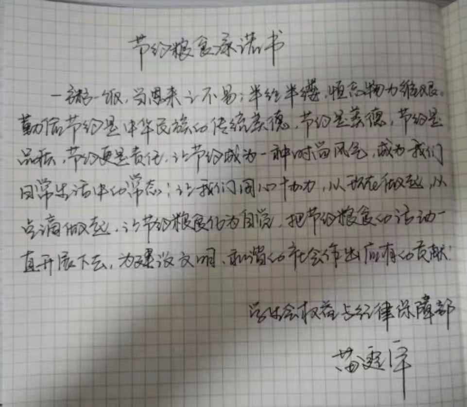 米饭粒粒念汗水,不惜粮食当自悔。谁也不会忘记祖祖辈辈用汗水演绎何处黄土不埋人的壮烈,而如今丰衣足食的我们也绝不能够抛弃艰苦朴素的美德,铺张浪费,为了进一步贯彻落实习近平总书记关于制止餐饮浪费的重要指示精神,2026世界杯官网同学们作出以下承诺: