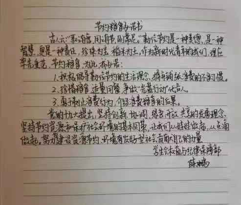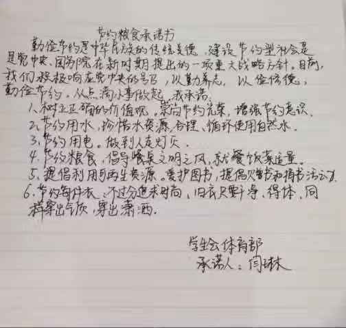 犹记锄禾日当午,最累汗滴禾下土,一粒粮食一分苦,该当珍惜心有数,粮食是地球赐给我们有限的礼物,爱护粮食就是珍惜生命之源,从同学们的一份份承诺中我们可以看到他们对于粮食的重视,也希望每一个人都可以拿出实际行动,为党为国家分忧,把爱惜粮食、节约粮食的活动扎扎实实地开展下去。