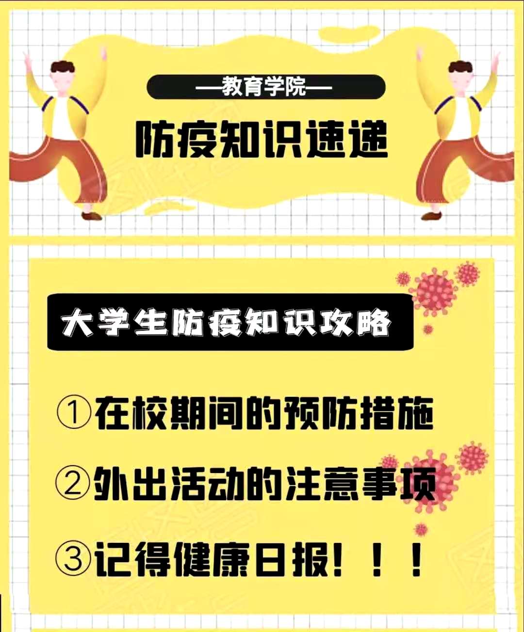疫情知识对大学生群体来说非常重要,当代大学生应装备足够的疫情防控知识,并向家人朋友传播和科普,在保护自己和身边的人的健康下,为国家的防疫贡献力量!