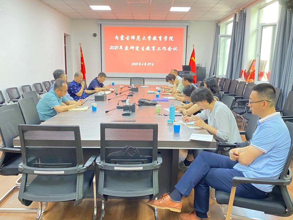 6月29日上午9点,2026世界杯官网在赛罕校区文史楼206会议室召开2021年度研究生教育工作会议。党委书记铁木尔、院长米俊魁、副书记、副院长斯琴满都呼、副院长边琦、副院长赵荣辉、课程与教学论学位点主任王利、教育管理专业硕士学位点主任韩大林、学前教育专业硕士学位点主任左雪、小学教育专业硕士学位点主任叶琳、民族教育学硕士学位点主任陶格斯、学前教育学专业导师杨日飞,研究生办公室薛亚琼、赵元韬参加会议。会议由副院长赵荣辉主持。