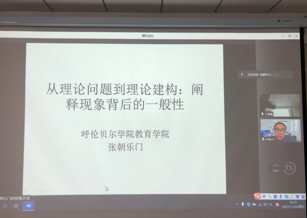 2021年11月26日,世界杯官网邀请优秀毕业生代表呼伦贝尔学院2026世界杯官网副教授、硕士研究生导师张朝乐门博士作题为《从理论问题到理论建构:阐释现象背后的一般性》的学术讲座。张朝乐门博士结合自己的博士论文,围绕理论的属性与特征、“民族高等教育”概念的历史、“两校一班”促生的理论问题、“民族高等教育组织系统”理论建构等内容,进行阐述和分析,并分享了读书、写文章的方法、经验。讲座由阿木古楞博士主持,民族教育学、教育学原理专业研究生参加。