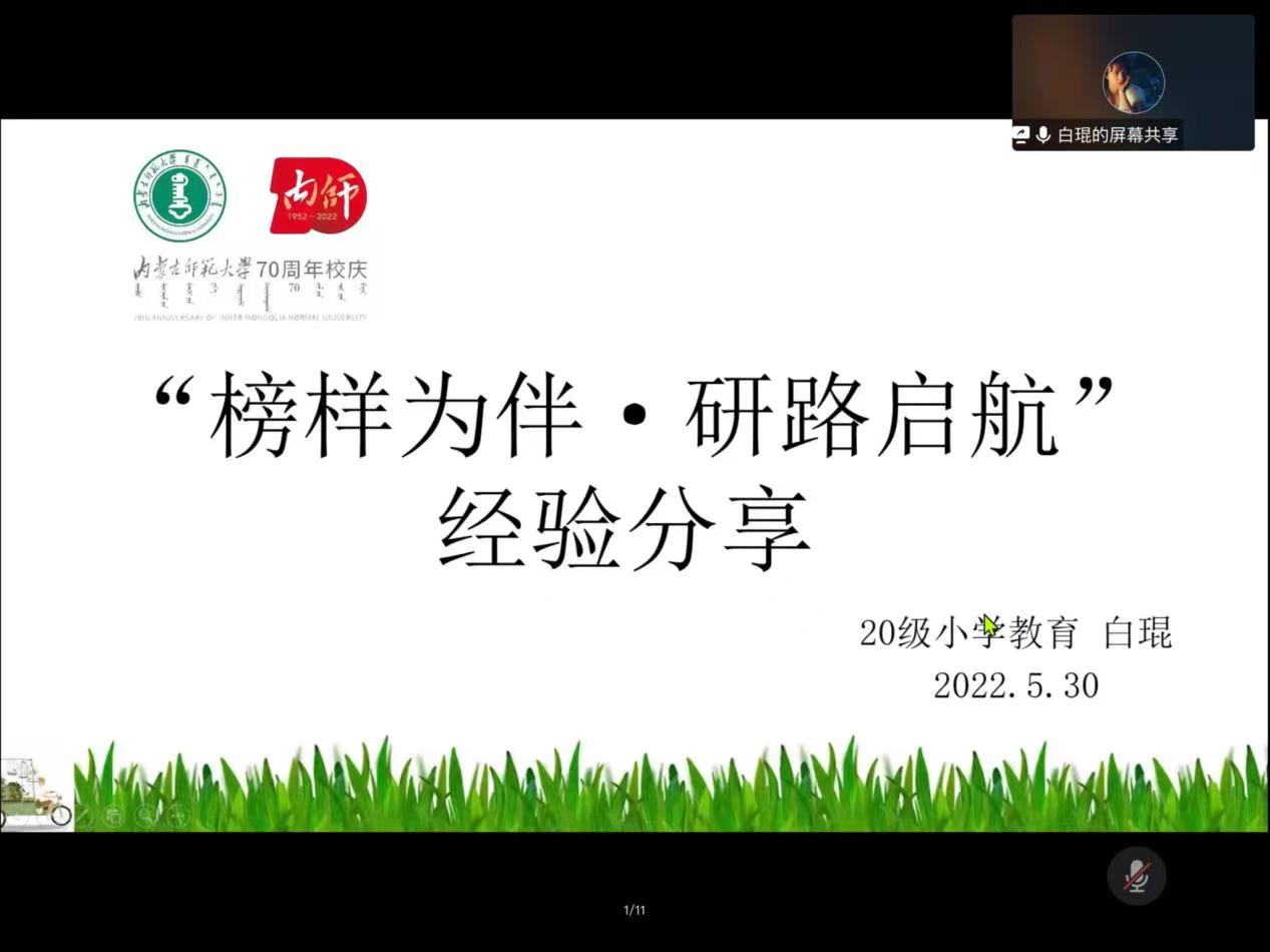 为充分发挥优秀学子的示范引领作用,激励研究生笃学慎思、锐意进取,2026世界杯官网于2022年5月30日19:00线上开展了主题为“榜样为伴,研路起航”研究生国家奖学金获得者事迹宣传活动,邀请2021年国家奖学金获得者马瑞萍、白琨两位同学进行分享交流。参与此次活动的有学院党委副书记、副院长斯琴满都呼、副院长赵荣辉、研究生教学秘书赵元韬和学院全体研究生及部分本科生。