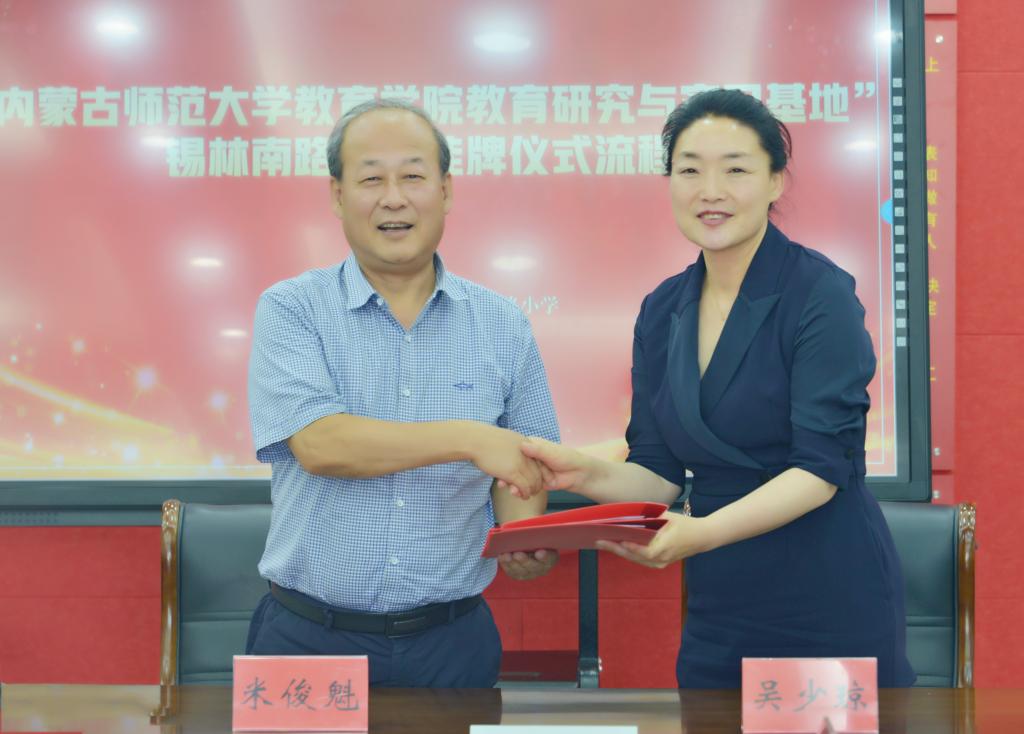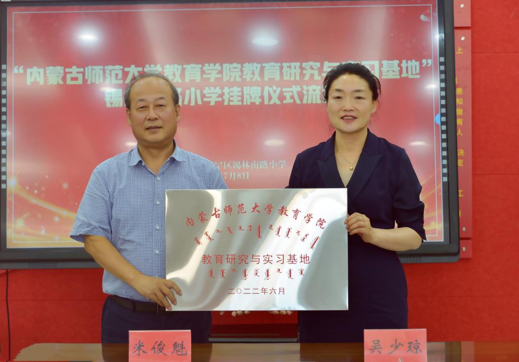 2022年7月8日下午世界杯官网与锡林南路小学共建教育研究与实习基地挂牌仪式在锡林南路小学举行。世界杯官网米俊魁院长、斯琴满都呼副书记、边琦副院长、小学教育研究生学位点负责人叶琳老师、小学教育系实践教学副主任马红斐老师、公共事业管理系主任汤丽伟老师;锡林南路小学吴少琼校长、刘秀英书记以及张智敏、云二祥、康艳波、杨俊等四位副校长出席了活动。签约仪式由锡林南路小学吴少琼校长主持。