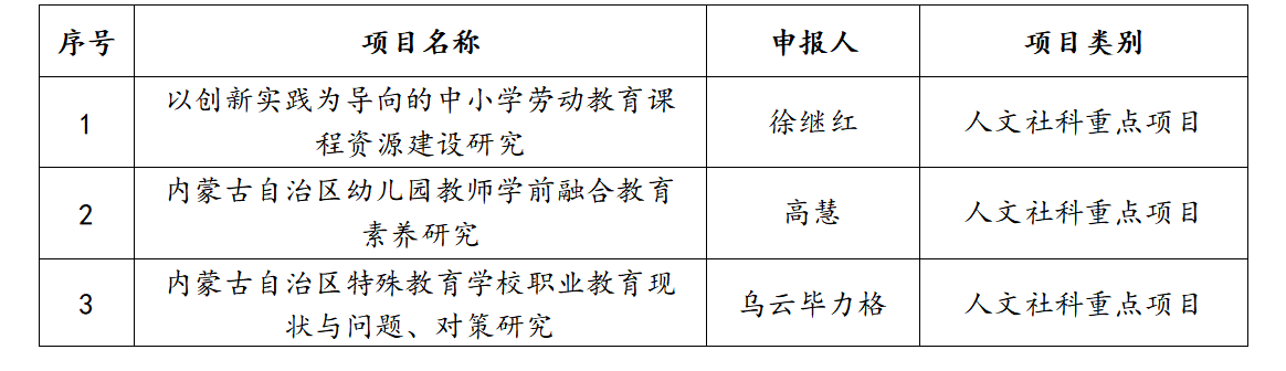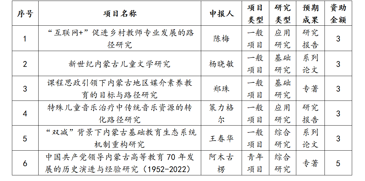 经过全院教师的共同努力,在相继获批2022年国家社科基金等各类项目之后,近期又获喜讯。徐继红、高慧、乌云毕力格三位老师获批2023年度高校科研重点项目。杨晓敏、陈梅、郑珠、策力格尔、王春华、阿木古楞六位老师获批2022年度自治区哲学社会科学规划项目。
