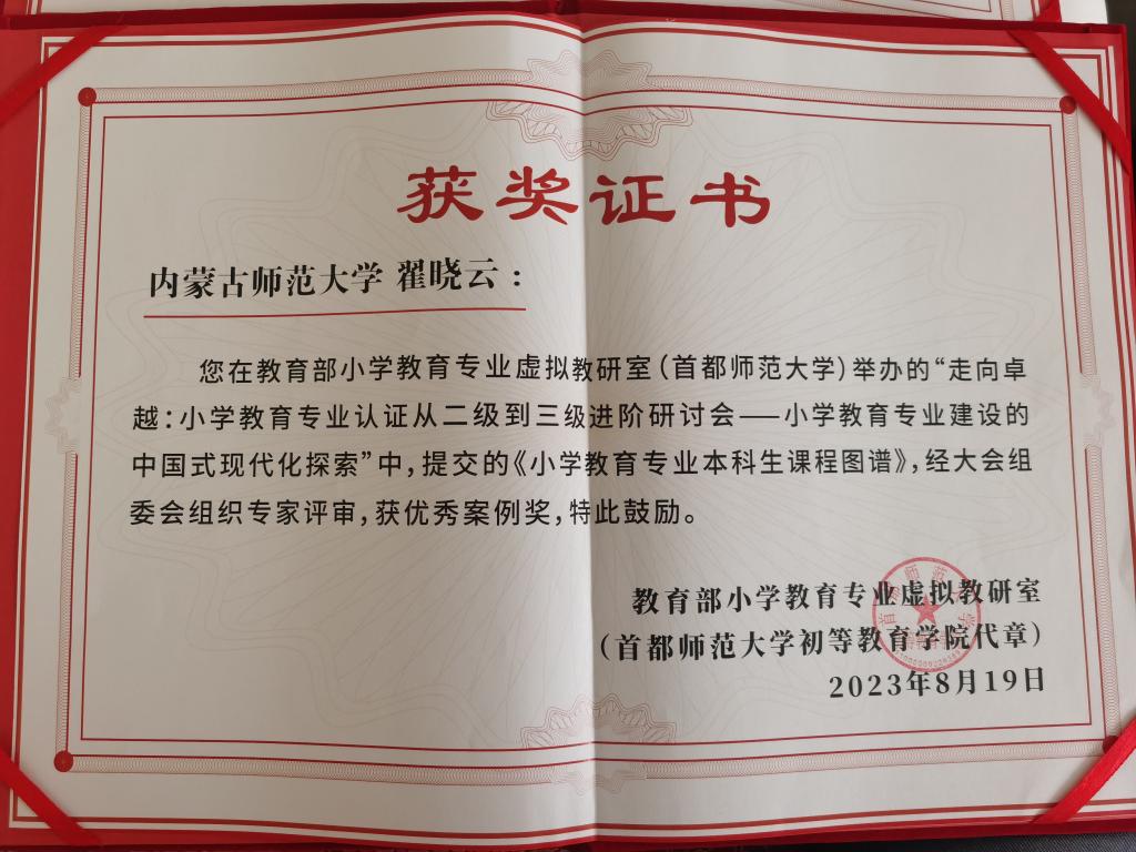 在教育部小学教育专业虚拟教研室建设研讨环节,公布了虚拟教研室征集案例获奖名单。小学教育系主任翟晓云副教授的“小学教育专业本科生课程图谱”和实践教学教研部副主任马红斐博士的“小学教育实践教学案例”荣获教育部小学教育专业虚拟教研室专业建设优秀案例奖。