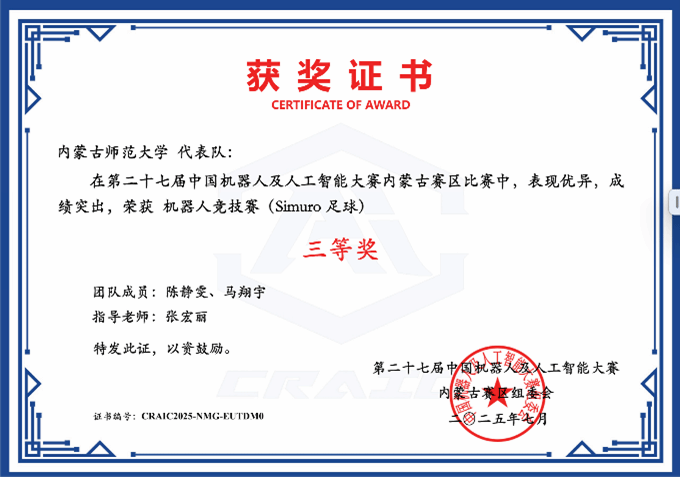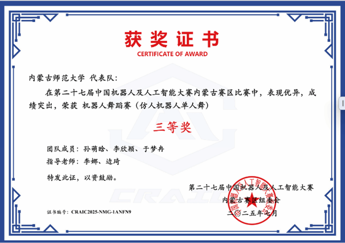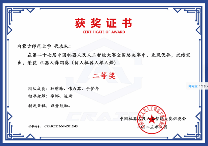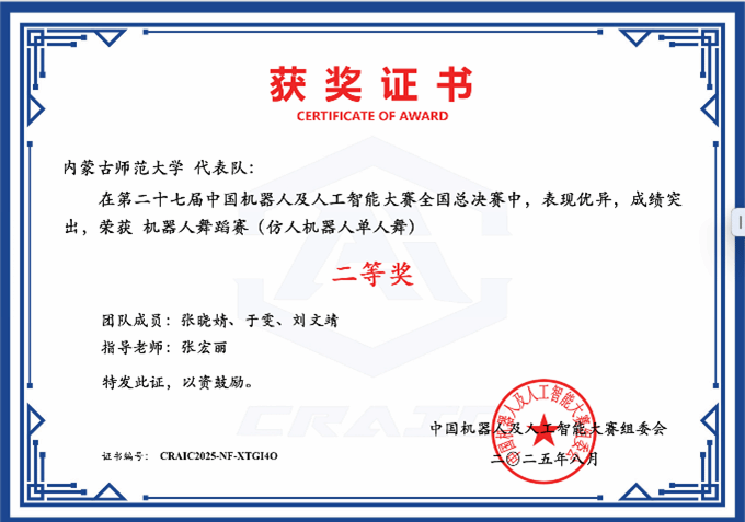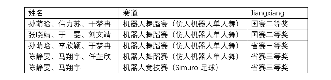 在近期闭幕的第二十七届中国机器人及人工智能大赛中,世界杯官网教育技术学专业研究生、本科生在“远程(线上)模式”的机器人舞蹈赛(仿人机器人单人舞)赛道中获得国赛二等奖两项、省级三等奖两项,机器人竞技赛(Simuro足球)赛道省级三等奖一项。获奖名单如下:
