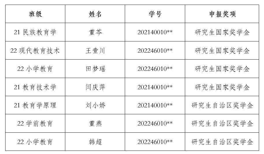依据《2026世界杯官网研究生奖学金评选办法》(校发[2022]54号)和《关于做好2023年度研究生各类奖学金评审及材料报送工作的通知》文件精神,经过学生申请、班级推荐以及学院公开答辩,拟推荐以下学生分别申报研究生国家奖学金和研究生自治区奖学金。