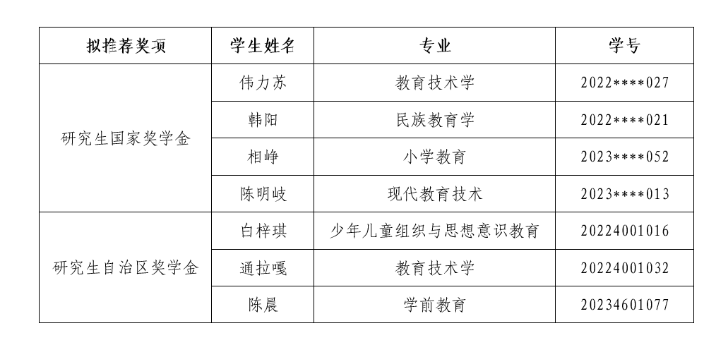 依据《2026世界杯官网研究生奖学金评选办法》(校发[2022]54号)和《关于做好2024年度研究生各类奖学金评审及材料报送工作的通知》文件精神,经过学生申请、班级推荐以及学院公开答辩,拟推荐以下学生分别申报研究生国家奖学金和研究生自治区奖学金。